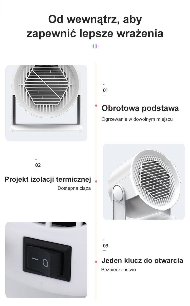 ● Przenośny grzejnik do domu zapewnia szybkie i równomierne ogrzewanie każdego pomieszczenia, gwarantując komfort nawet w najchłodniejsze dni. ● Kompaktowy i lekki design umożliwia łatwe przenoszenie grzejnika tam, gdzie go najbardziej potrzebujesz, bez konieczności montażu. ● Energooszczędna technologia pozwala na skuteczne ogrzewanie przy niskim zużyciu prądu, co przekłada się na niższe rachunki za energię. ● Bezpieczny w użytkowaniu – wyposażony w zabezpieczenie przed przegrzaniem oraz stabilną podstawę, co minimalizuje ryzyko wypadków. ● Cicha praca urządzenia sprawia, że grzejnik doskonale sprawdzi się zarówno w sypialni, jak i w biurze, nie zakłócając codziennych czynności.
