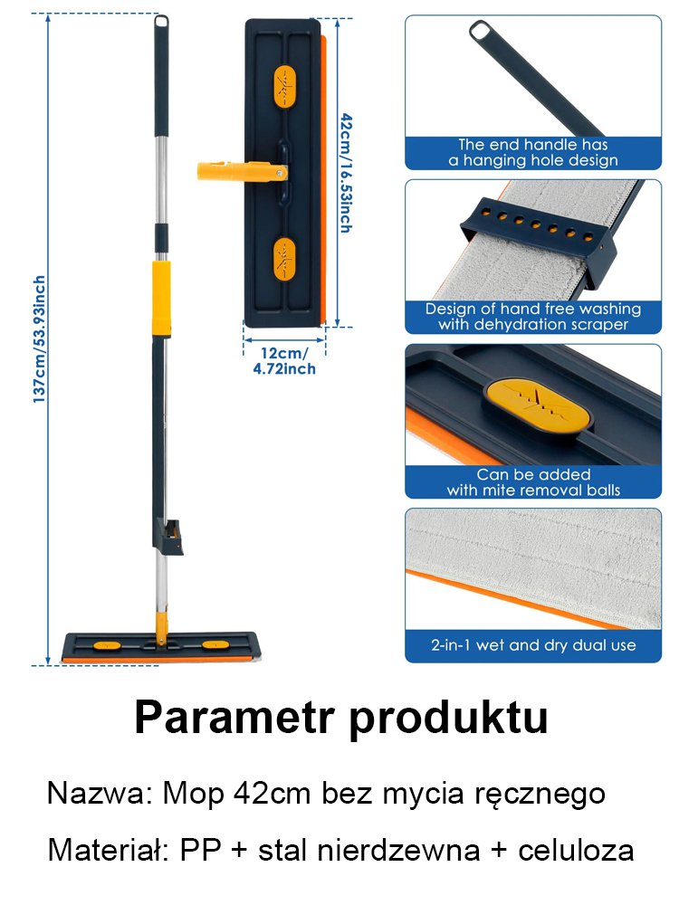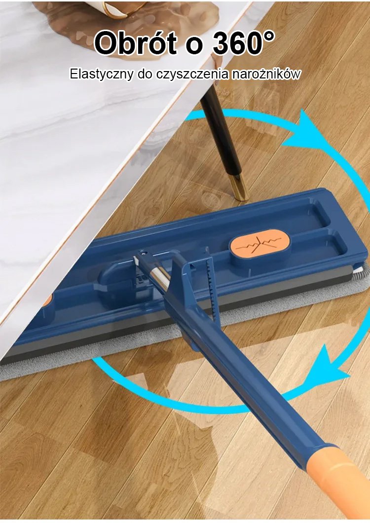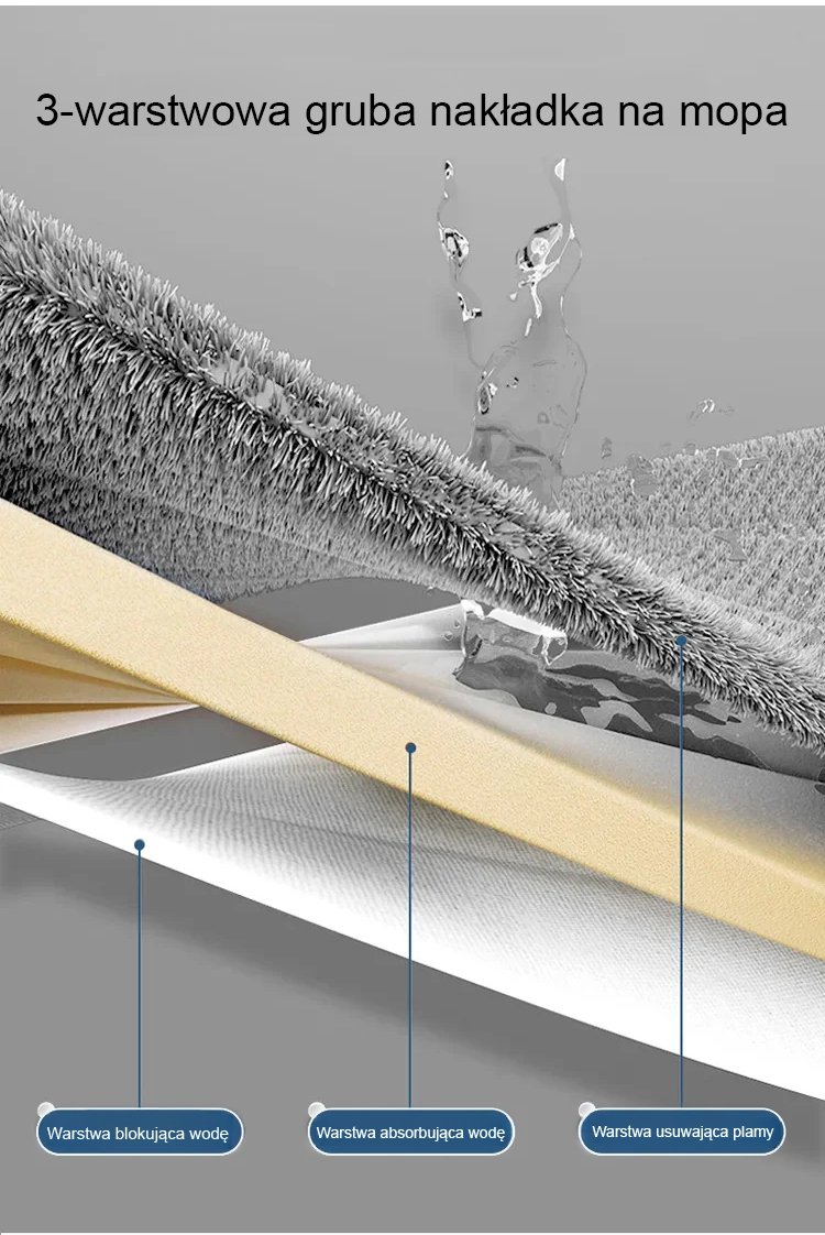 ● Nowy duży mop płaski posiada szeroką powierzchnię czyszczącą, dzięki czemu sprzątanie dużych pomieszczeń jest szybkie i wydajne. ● Wykonany z wysokiej jakości materiałów, mop jest trwały, odporny na zużycie i łatwy w utrzymaniu w czystości przez długi czas. ● Innowacyjny mechanizm wyciskania pozwala na wygodne usuwanie nadmiaru wody bez brudzenia rąk, co podnosi komfort użytkowania. ● Mop płaski doskonale nadaje się do różnych rodzajów podłóg, zarówno drewnianych, jak i płytek, zapewniając dokładne czyszczenie bez zarysowań. ● Ergonomiczny uchwyt oraz lekka konstrukcja sprawiają, że sprzątanie staje się mniej męczące i bardziej efektywne nawet przy częstym użytkowaniu.